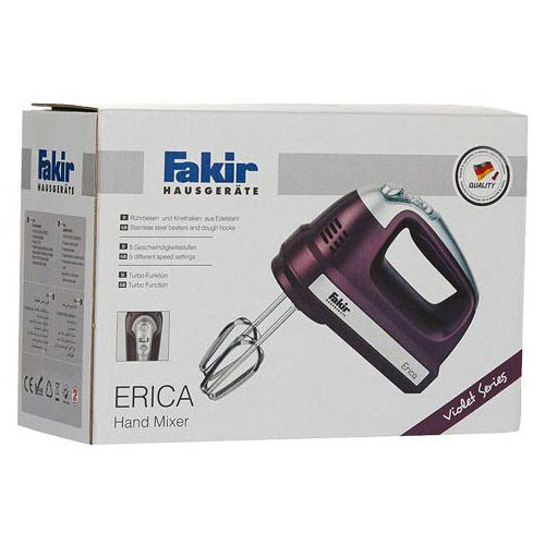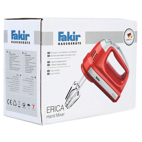 همزن برقی فکر مدل Erica با توان 500 وات ساخت شرکت Fakir آلمان است. این همزن به صورت دستی استفاده می شود و فاقد کاسه است. محدوده توانی که مصرف می کند در حدود 500 تا 600 وات است که برای یک همزن دستی کاملا مناسب است. جنس بدنه این همزن از پلاستیک است و دستگیره آن بسیار راحت است و تنها 0.5 کیلوگرم وزن دارد، به این ترتیب همزدن مواد با آن به راحتی انجام می شود.